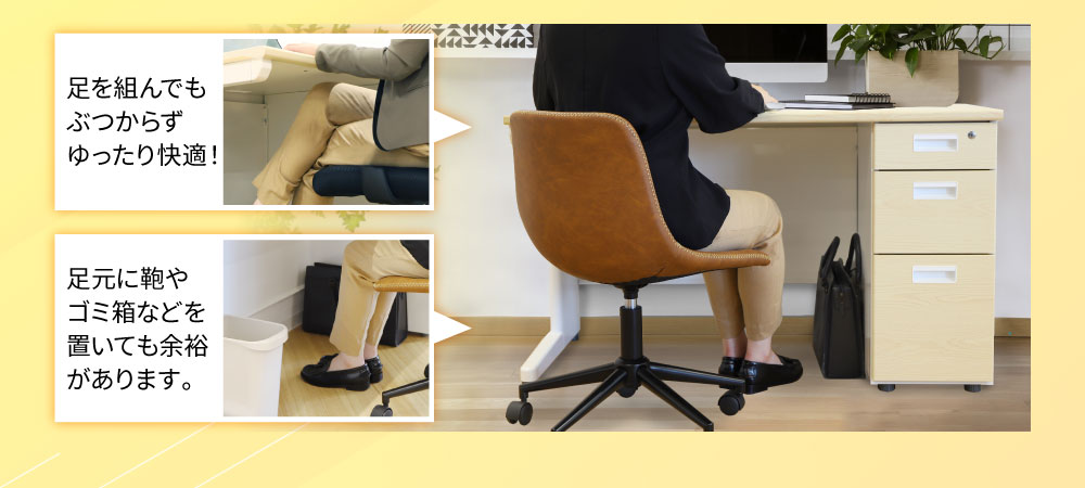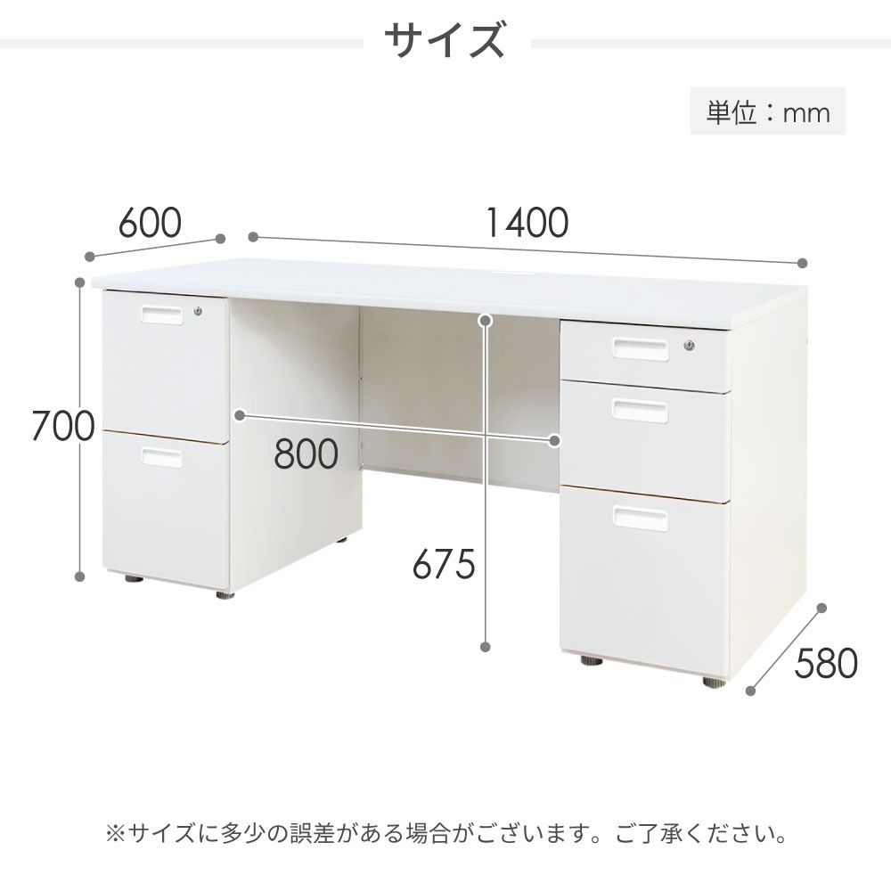 天板:パーティクルボード、メラミン化粧板 脚フレーム・幕板・袖箱:スチール、粉体塗装 耐荷重:天板/100kg、3段袖箱上段/5kg、中段/10kg、下段/25kg、2段袖箱上段/20kg、下段/20kg |