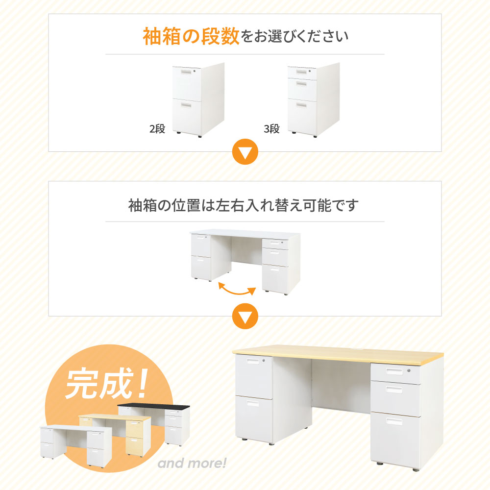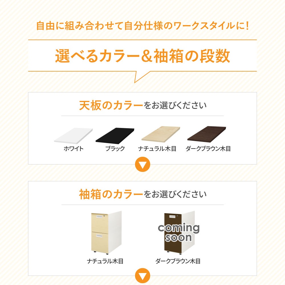| カラー | 本体:ホワイト 袖箱:ナチュラル(木目調)、ダークブラウン(木目調) 天板:ホワイト、ブラック、ナチュラル(木目調) |