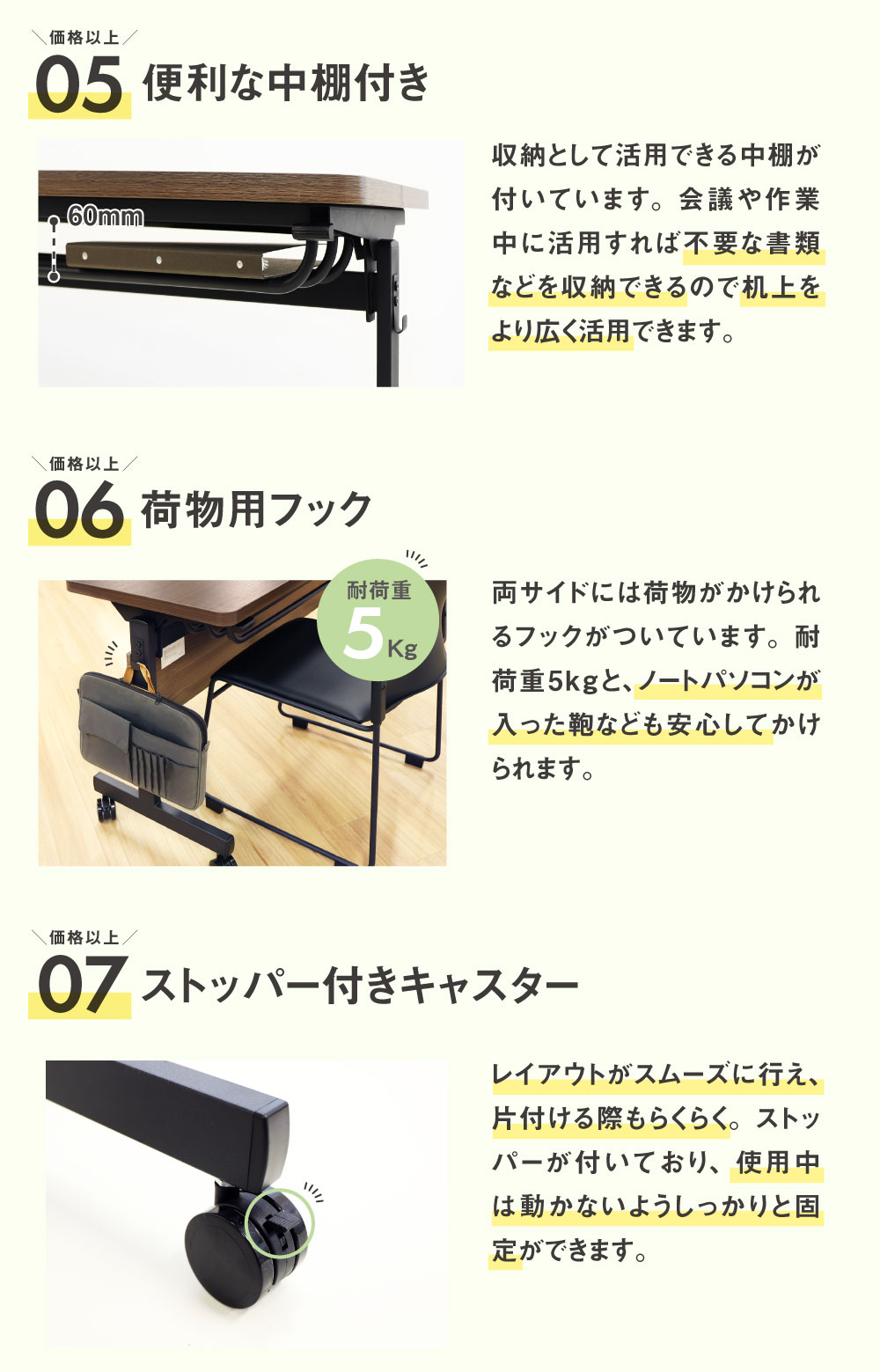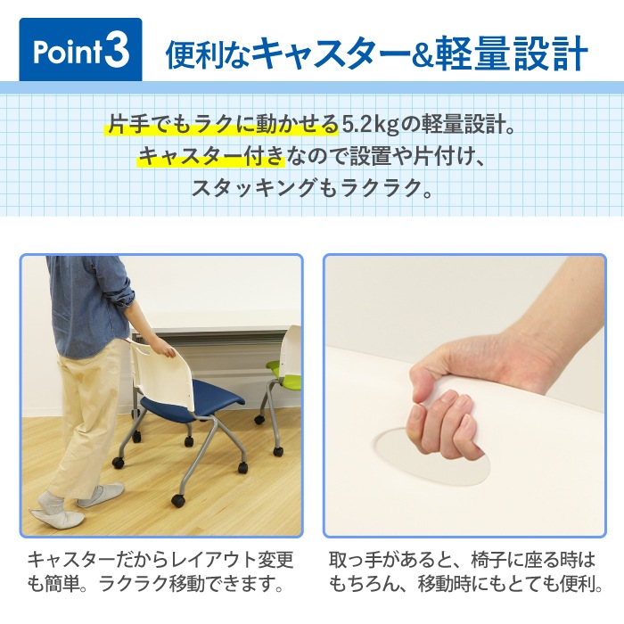 | フォールディングテーブルとスタッキングチェアのセットです。 【テーブル】 天板には軽さと高い強度が特徴のハニカム構造を採用。 厚さ30mmのしっかりした作りでありながら、移動のしやすい重量を実現しました。 操作感の軽いレバーで片手でらくらくと折りたたむことができます。 スタッキング収納対応。幕板は取り付け・取り外しが自由です。 様々な空間に馴染むシンプルなデザインで、カラーは3色。 明るく清潔感のある定番のホワイト、ブラックのフレームで重厚な雰囲気のウォールナット、上品な木目の美しいナチュラルからお選び頂けます。 【チェア】 人間工学に基づく設計の大型背面と、ほどよい弾力のソフトな座面のミーティングチェアです。 キャスターなのでレイアウト変更も簡単。 使わない時は平行スタッキングでコンパクトに収納が可能。 わずか5.2kgと軽量で、背もたれには取っ手もついているので、設置や片付けもラクラクです。 お届け後すぐにご使用いただける完成品です。 |