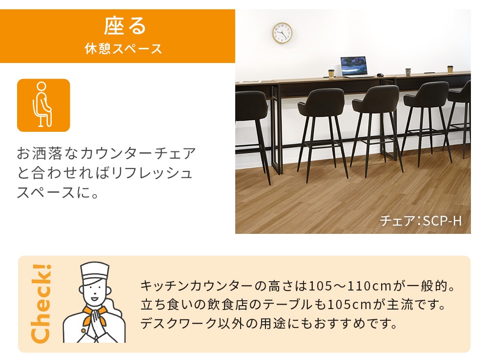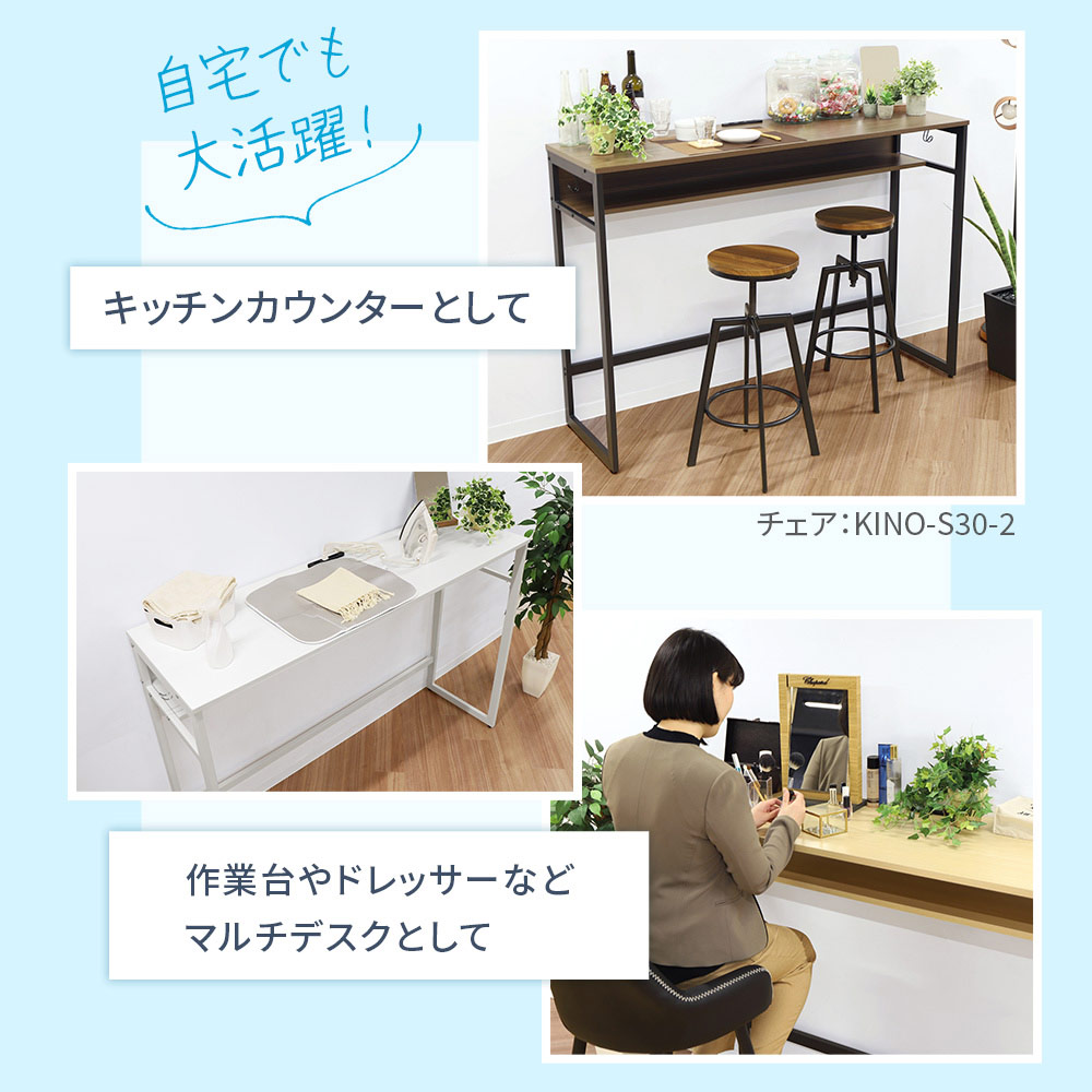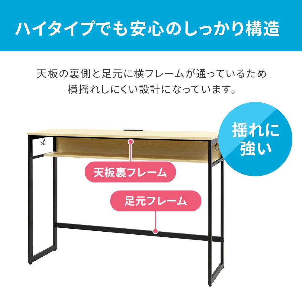 | 集中力アップや腰痛、肩凝りなど身体への負担軽減で注目される「立ち作業」にぴったりのハイデスク。 高さ105cmの天板は、スタンディングデスクとしてはもちろん、ハイスツールと併用してカウンターにもおすすめ。立っても座っても、いいとこ取りで便利に使えます。 荷物の整理に便利な中棚やフック、コンセントとUSBポートの電源タップと機能も充実。 3色から選べる木製の天板と、スチールフレームのお洒落なデザインです。 |