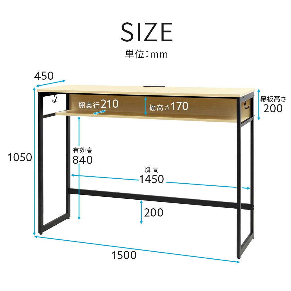 天板・幕板・棚板:低圧メラミン樹脂中質繊維板、PVCエッジ フレーム・脚部:スチール(粉体塗装) アジャスター:PP フック:スチール(クロームメッキ仕上げ) コンセント:合成樹脂、定格電圧/100V(屋内用)USBX1 コード長さ約2メートル 耐荷重:30kg |